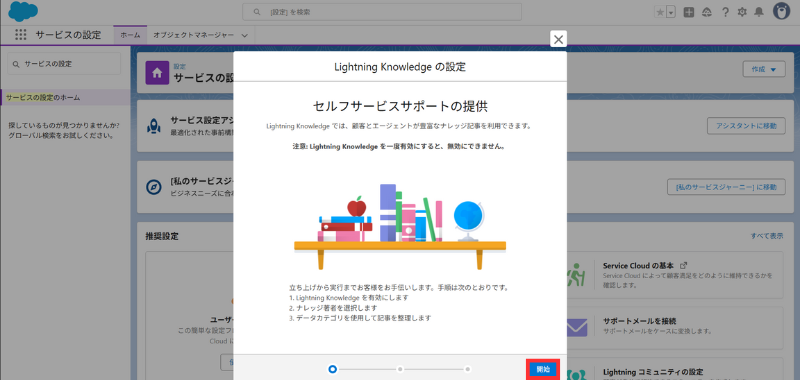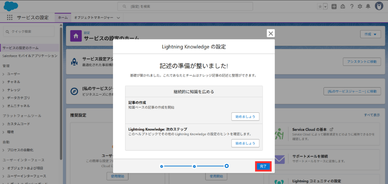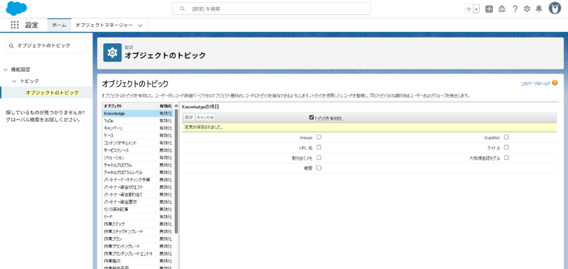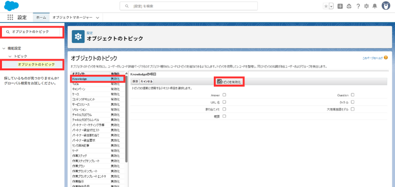 - オブジェクト 「Knowledge」 を選択 → [トピックを有効化] → [保存]