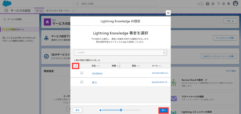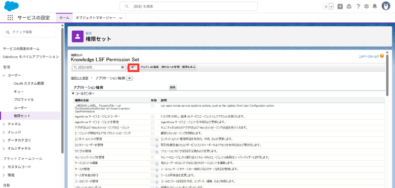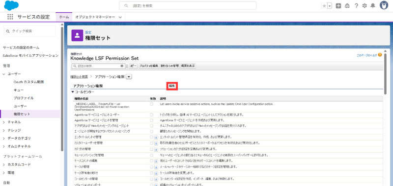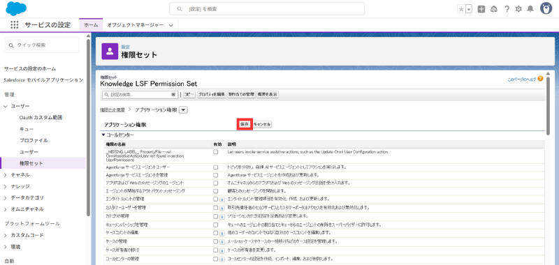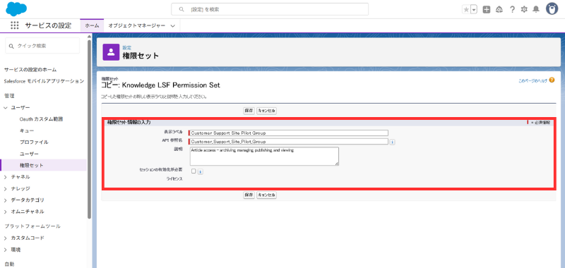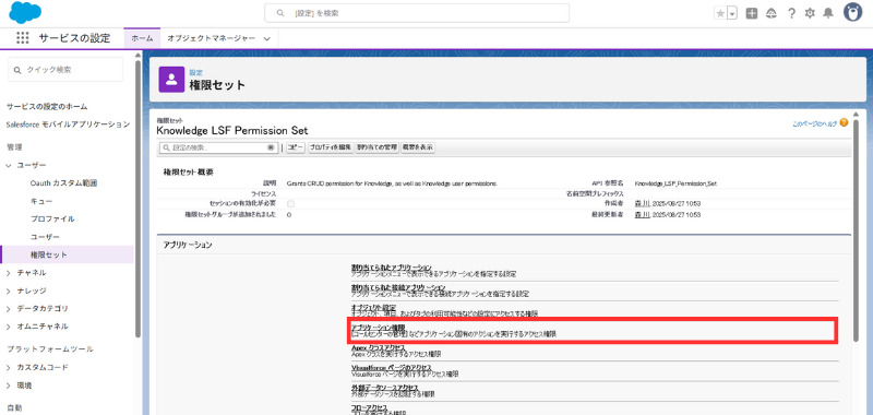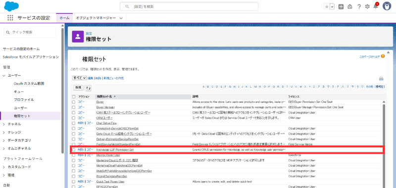 - **[権限セット]**から Knowledge LSF Permission Set を開く