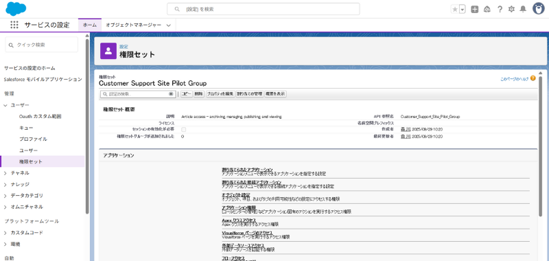 確認ポイント:選択済みプロファイルにSystem Administrator + Custom: Support Profile、選択済み権限セットにPilot Group。