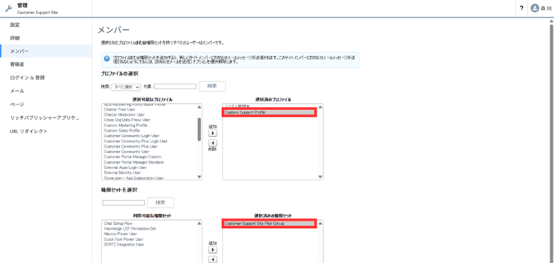 - 利用可能なプロファイルから Custom: Support Profile を 利用可能な権限セットから Customer Support Site Pilot Group を [追加]
