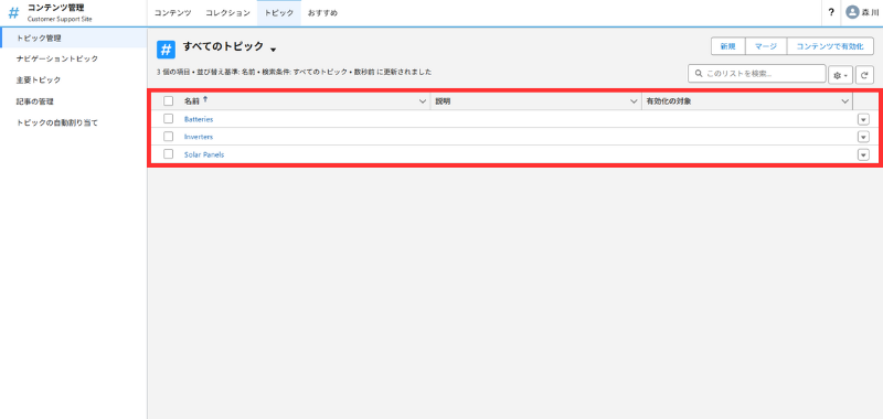 - [すべてのトピック] で、3つのトピックが作成済みであることを確認