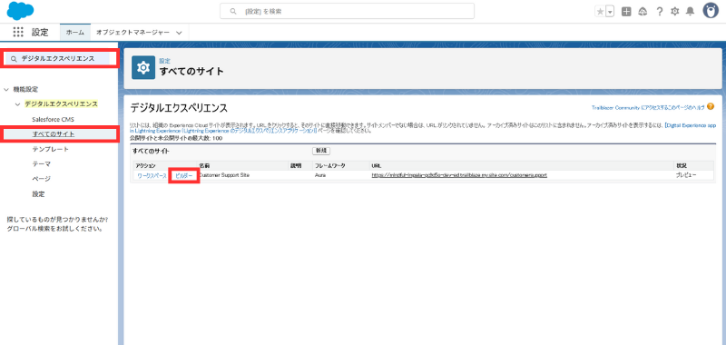 - 左検索で デジタルエクスペリエンス → すべてのサイト → 対象行の ビルダー