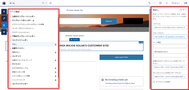 - 左上 ページ構造 → コンテンツヘッダー > 見出し を選択
